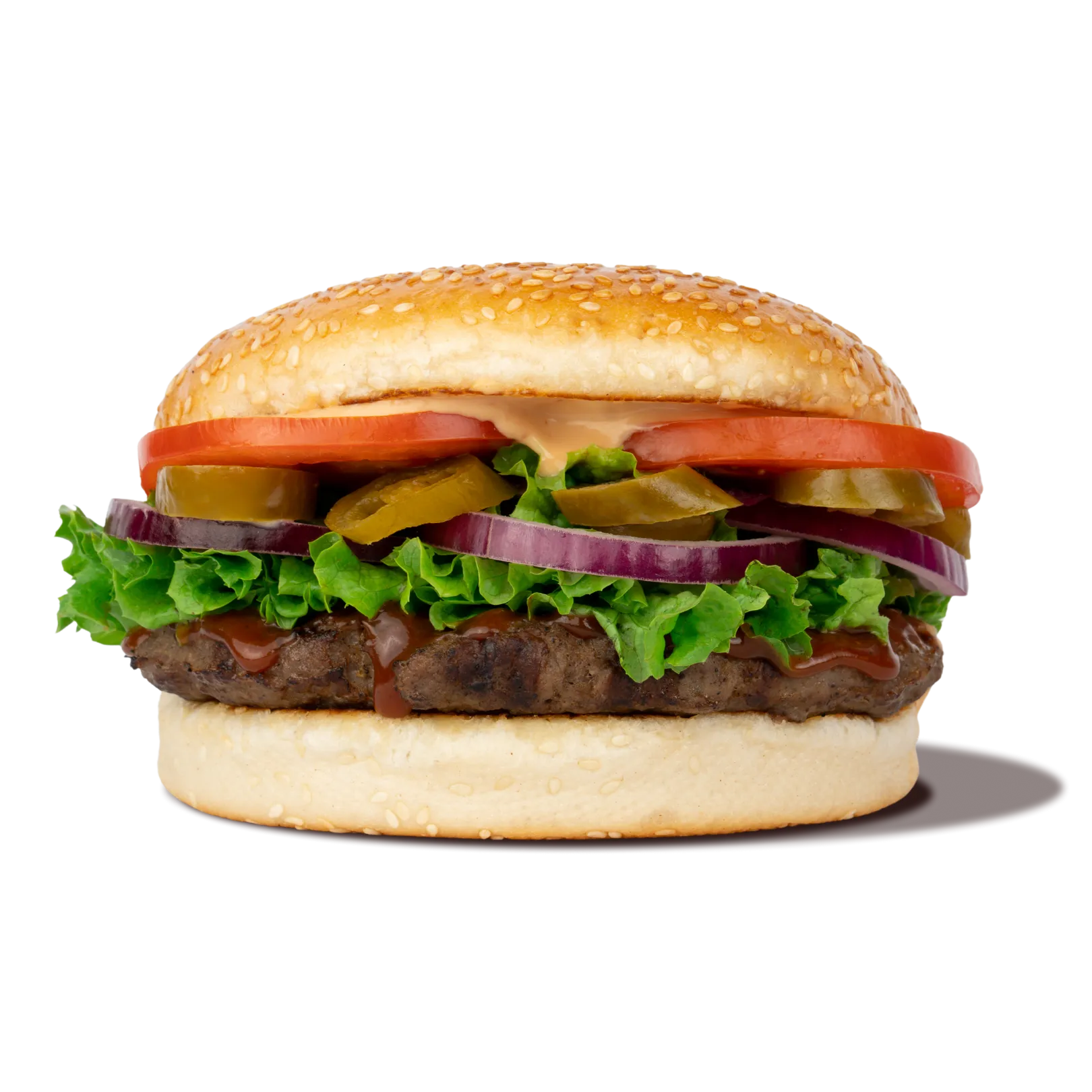 A flame-grilled beef patty topped with crisp lettuce, onion, and tomato, kicked up with smoky chipotle sauce and a spicy jalapeño slice. All packed inside a toasted 5-inch sesame bun for a bold, fiery bite.