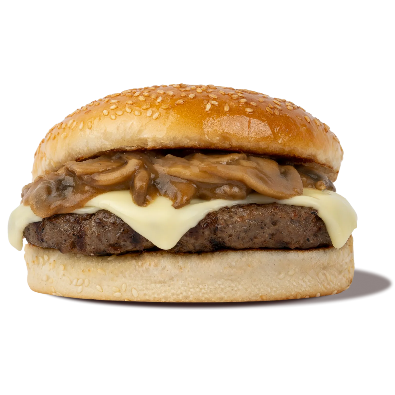 A flame-grilled beef patty smothered in rich mushroom sauce and melted white cheddar cheese, all served on a toasted 5-inch sesame bun. Comfort and indulgence in every bite.