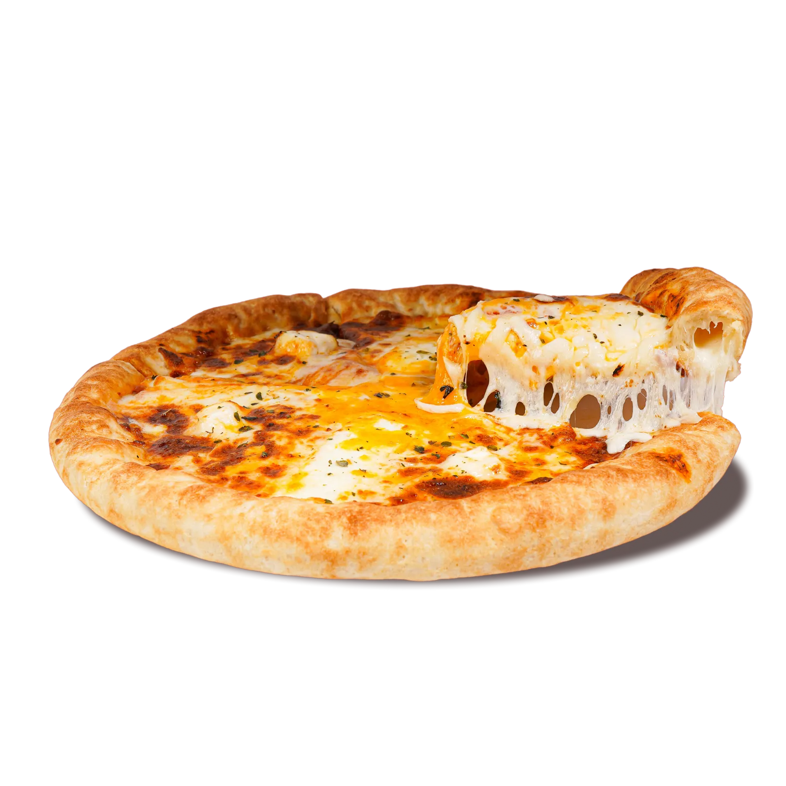 Simple, timeless, and cheesy. A golden crust topped with rich pizza sauce and loads of melted mozzarella, the perfect bite every time.
