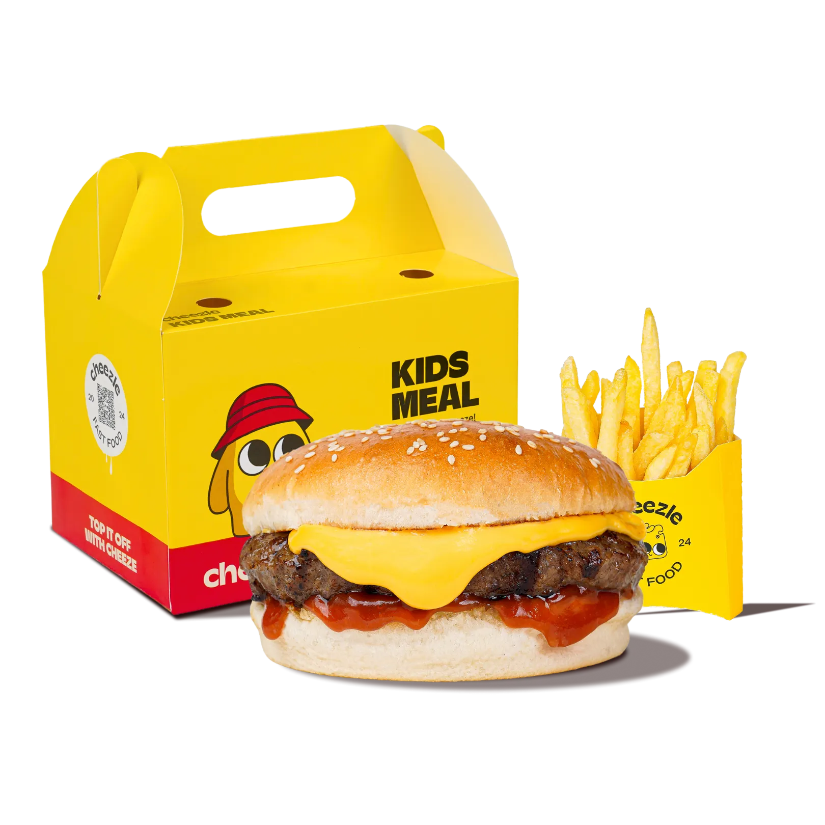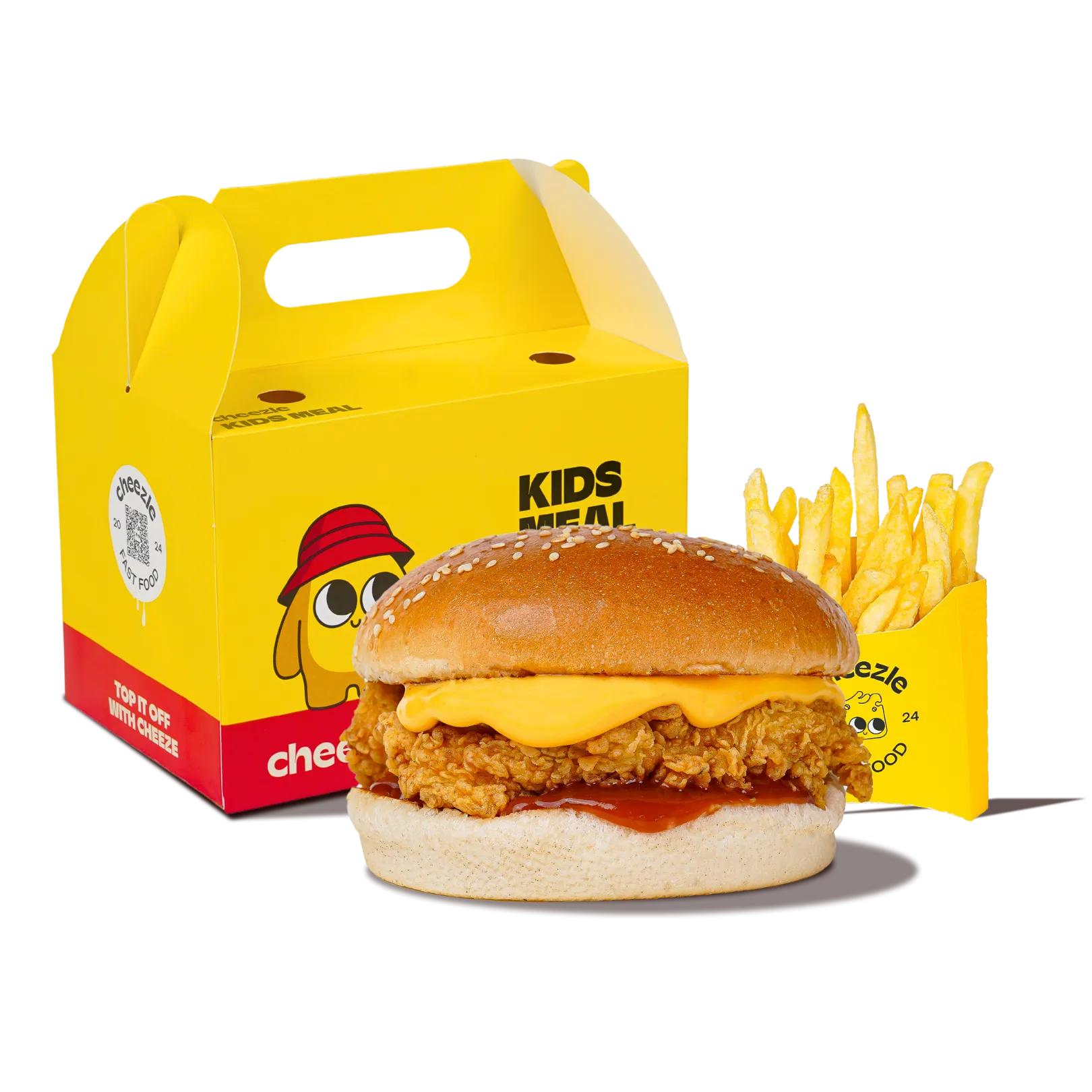 Crispy fried Cheezle sticks and a mini hotdog, served with golden kids fries, a refreshing kids juice, and a fun surprise toy. Perfectly sized, playful, and full of cheesy goodness!