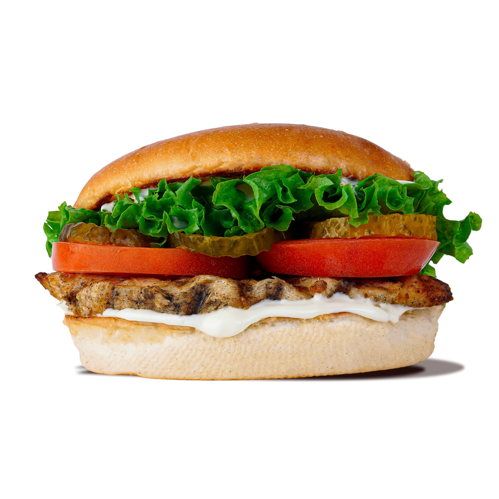 A flame-grilled chicken breast topped with fresh lettuce, tomato, and pickles, finished with a zesty garlic sauce. All nestled inside a toasted 5-inch sesame bun for a smoky, refreshing bite.