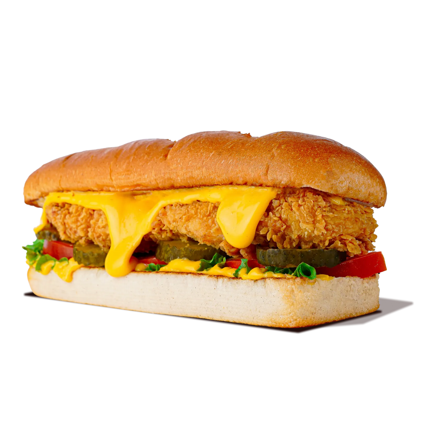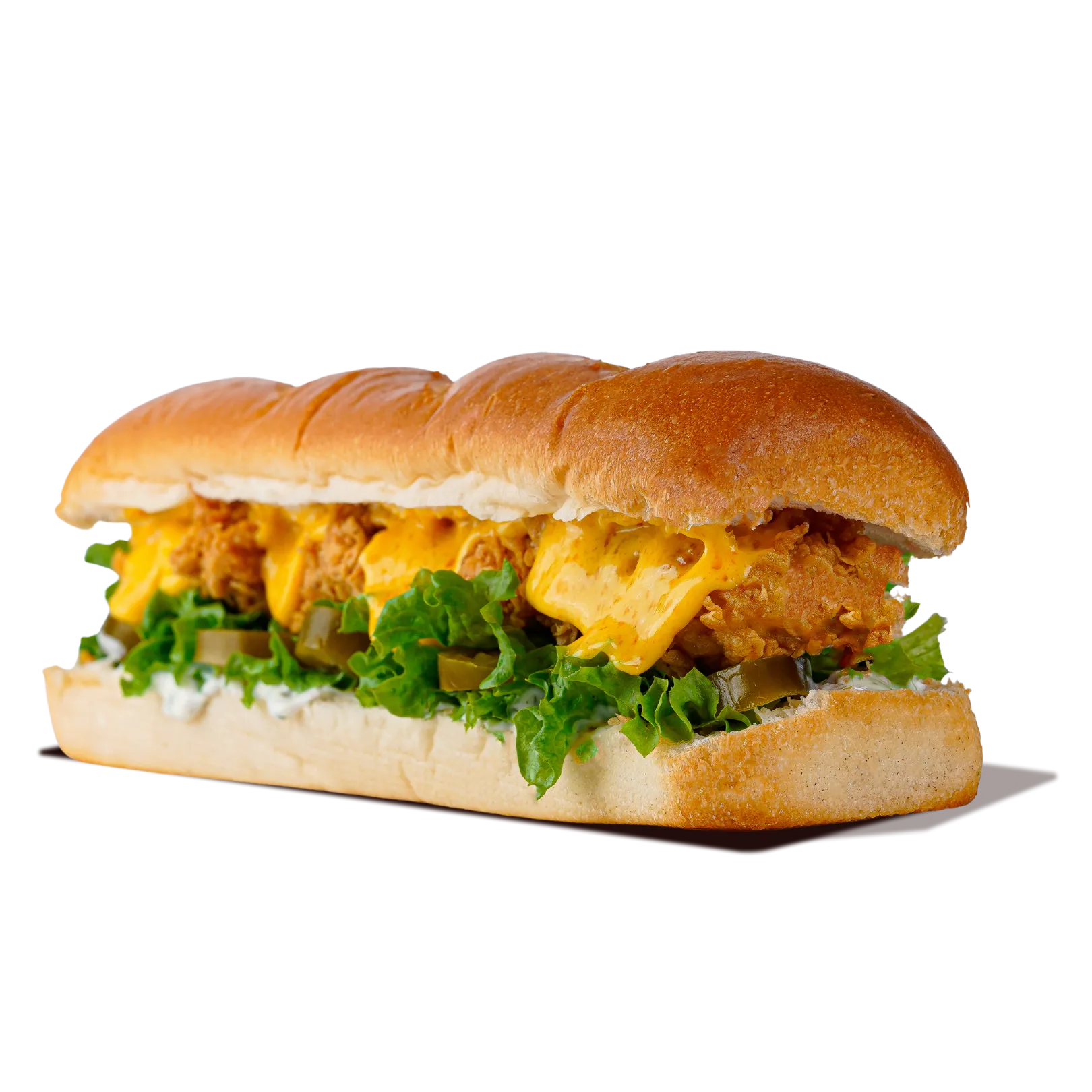 A crispy chicken breast paired with two gooey mozzarella sticks, fresh lettuce, and smothered in creamy Cheezle and garlic sauces. Served on a toasted 5-inch sesame bun for a cheesy, savory bite.