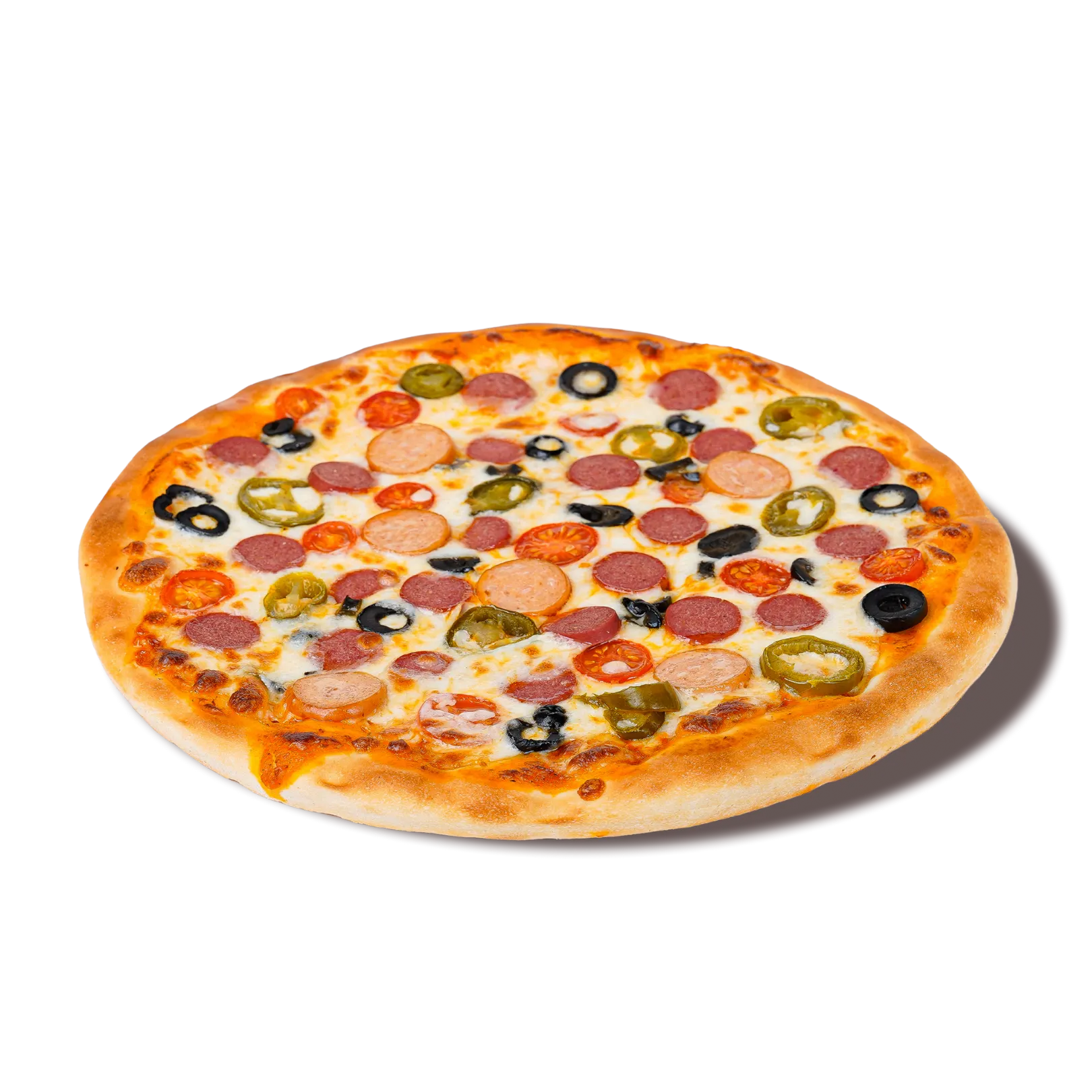 Turn up the heat! A cheesy base with smoky hotdog slices, fresh cherry tomatoes, black olives, and fiery jalapeños, all layered over rich pizza sauce and melty mozzarella. A bold twist on classic comfort