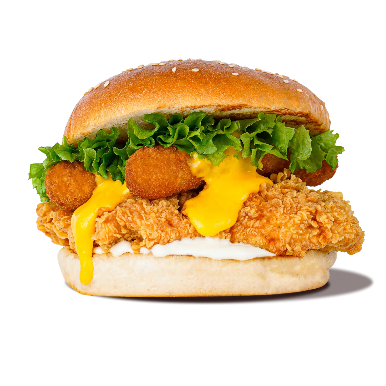 A crispy chicken breast topped with fresh lettuce, ripe tomato, and crunchy pickles, all layered with creamy Cheezle sauce. Served on a soft 22 cm bun for a perfectly balanced, cheesy crunch.
