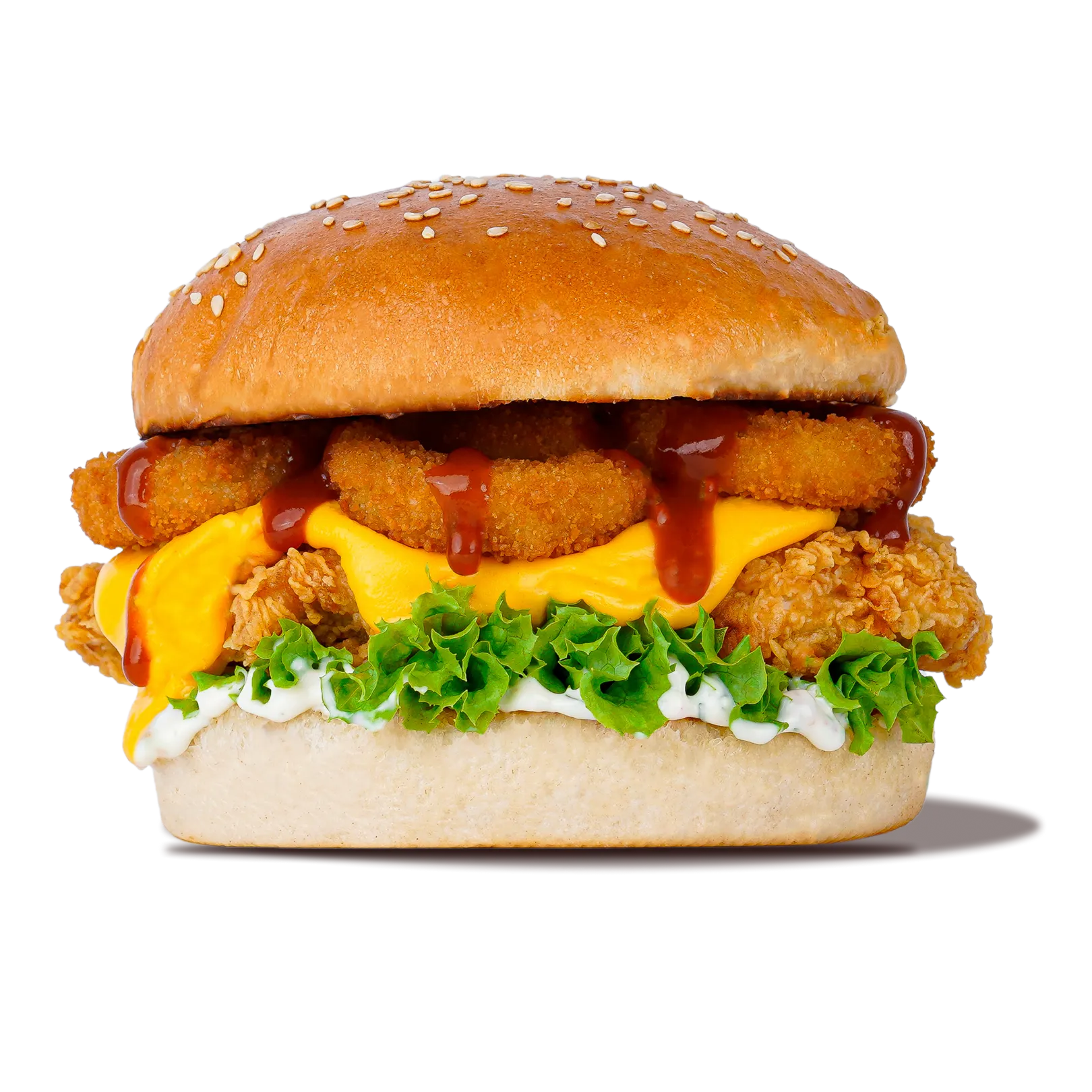 A crispy chicken breast stacked with three golden onion rings, fresh lettuce, and layered with creamy Cheezle, smoky chipotle, and spicy jalapeño sauces. All served on a toasted 5-inch sesame bun for a fiery, crunchy delight.